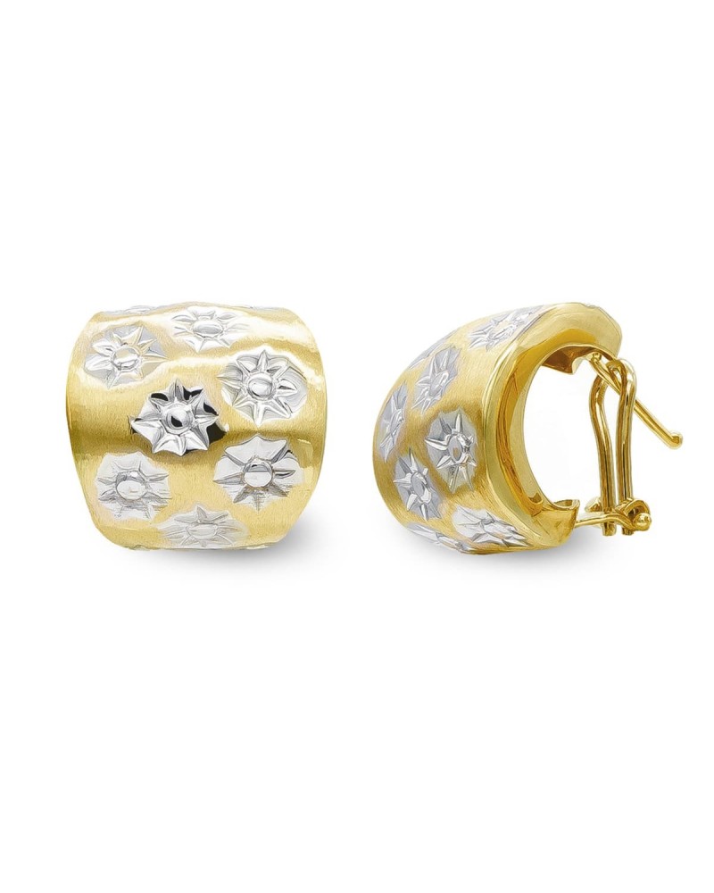 Estos sofisticados pendientes de oro bicolor destacan por su diseño geométrico cuadrado con motivos de estrella en relieve. La superficie presenta una elegante combinación de oro amarillo satinado como base y estrellas de oro blanco que crean un contraste visual muy atractivo. El acabado mate del oro amarillo resalta la brillantez de las circonitas incrustadas en algunos de los motivos estrella.