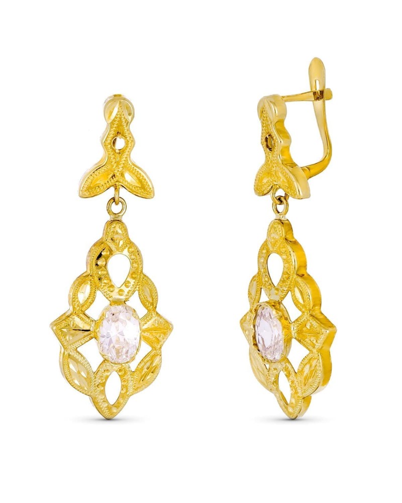 Estos elegantes pendientes presentan un diseño cubano lapidado que destaca por sus formas geométricas talladas con precisión artesanal. El oro amarillo de 18 quilates luce un acabado brillante que resalta los patrones ornamentales, mientras que la circonita central aporta un punto de luz que realza toda la composición. Su estructura colgante combina tradición orfebre con un toque contemporáneo muy sofisticado.