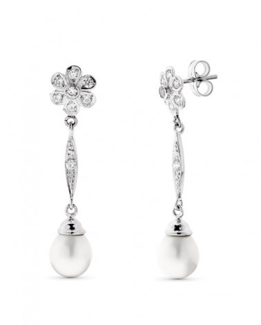 Estos excepcionales pendientes combinan la tradición de las perlas con un diseño contemporáneo lleno de luminosidad. La pieza superior presenta una delicada flor de oro blanco engastada con circonitas brillantes que captan la luz desde múltiples ángulos. De esta flor pende un elegante elemento alargado, también adornado con circonitas, que conecta armoniosamente con una perla cultivada de acabado nacarado que aporta la elegancia atemporal característica de estas gemas orgánicas.