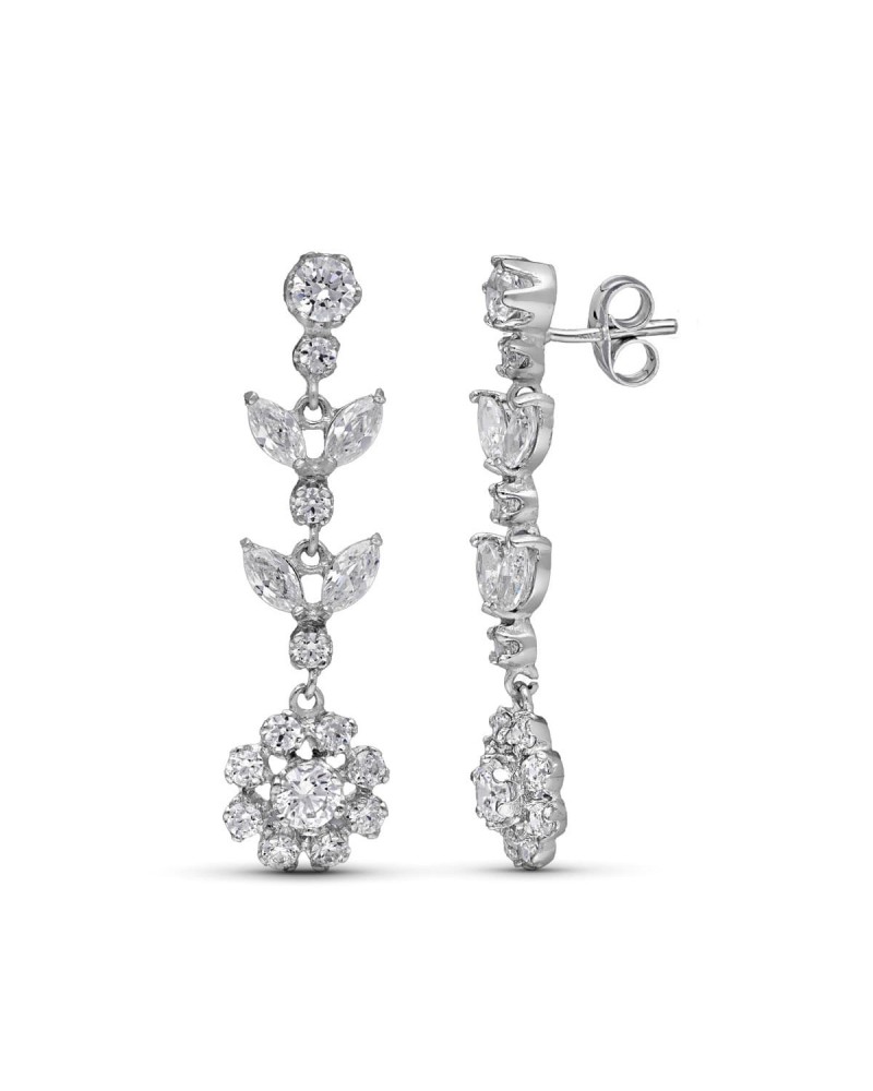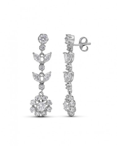 Estos elegantes pendientes largos presentan un diseño sofisticado en cascada con circonitas brillantes engastadas en oro blanco de 18 kilates. El diseño se compone de elementos florales y circulares que crean un movimiento visual ascendente, culminando en una roseta central en la parte inferior que aporta un toque de distinción y elegancia.