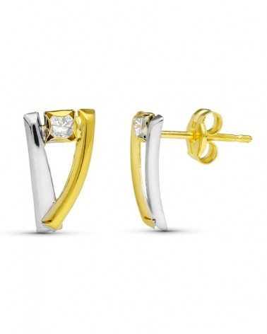 Estos elegantes pendientes presentan un sofisticado diseño de bandas geométricas que combina armoniosamente el oro amarillo y blanco en un acabado bicolor contemporáneo. Su forma angular y moderna crea un juego visual atractivo que refleja la luz de manera excepcional, aportando dinamismo y elegancia a cualquier look.