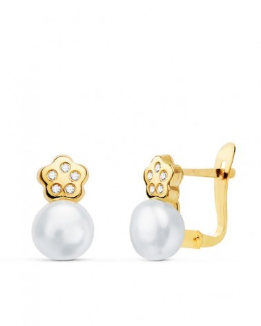 Pendientes oro 18k flor con perlas y circonitas 11x6mm