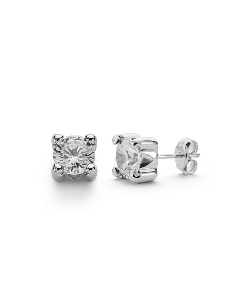 Estos pendientes de oro blanco de 9 quilates presentan un diseño clásico y atemporal con una circonita central de 5 mm que destaca por su brillo cristalino. La circonita está perfectamente engastada mediante cuatro garras que aseguran la piedra mientras permiten que la luz la atraviese completamente, creando destellos luminosos muy atractivos.