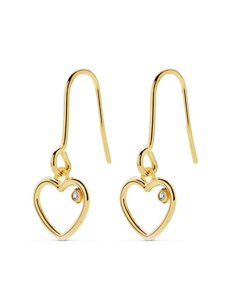 Estos preciosos pendientes presentan un diseño romántico con forma de corazón calado en oro amarillo de 18 kilates. Cada corazón luce una pequeña circonita brillante estratégicamente colocada que aporta un toque de luminosidad y elegancia. El acabado pulido del oro amarillo realza la belleza del diseño, creando un contraste perfecto con el brillo de la circonita.