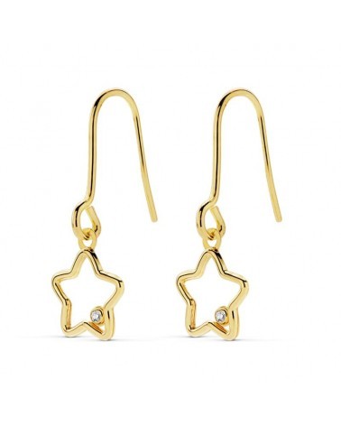 Fabricados en oro amarillo de 18 kilates con acabado pulido brillante, estos pendientes tienen unas medidas de 22x8 mm y un peso aproximado de 0,6 gramos. La circonita está engastada de manera segura en cada estrella, y el cierre de gancho garantiza una sujeción cómoda y fiable para el uso diario.