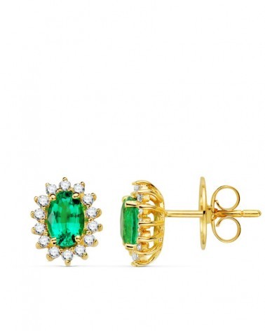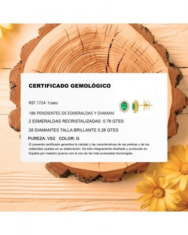 Fabricados en oro amarillo de 18 quilates, incorporan una esmeralda recristalizada central y 28 diamantes de laboratorio de 0,78 quilates en total con calidad VS2-G. Las medidas de 6x4 mm y el peso aproximado de 2,0 gramos los hacen muy cómodos para el uso diario. El cierre de presión garantiza total seguridad.