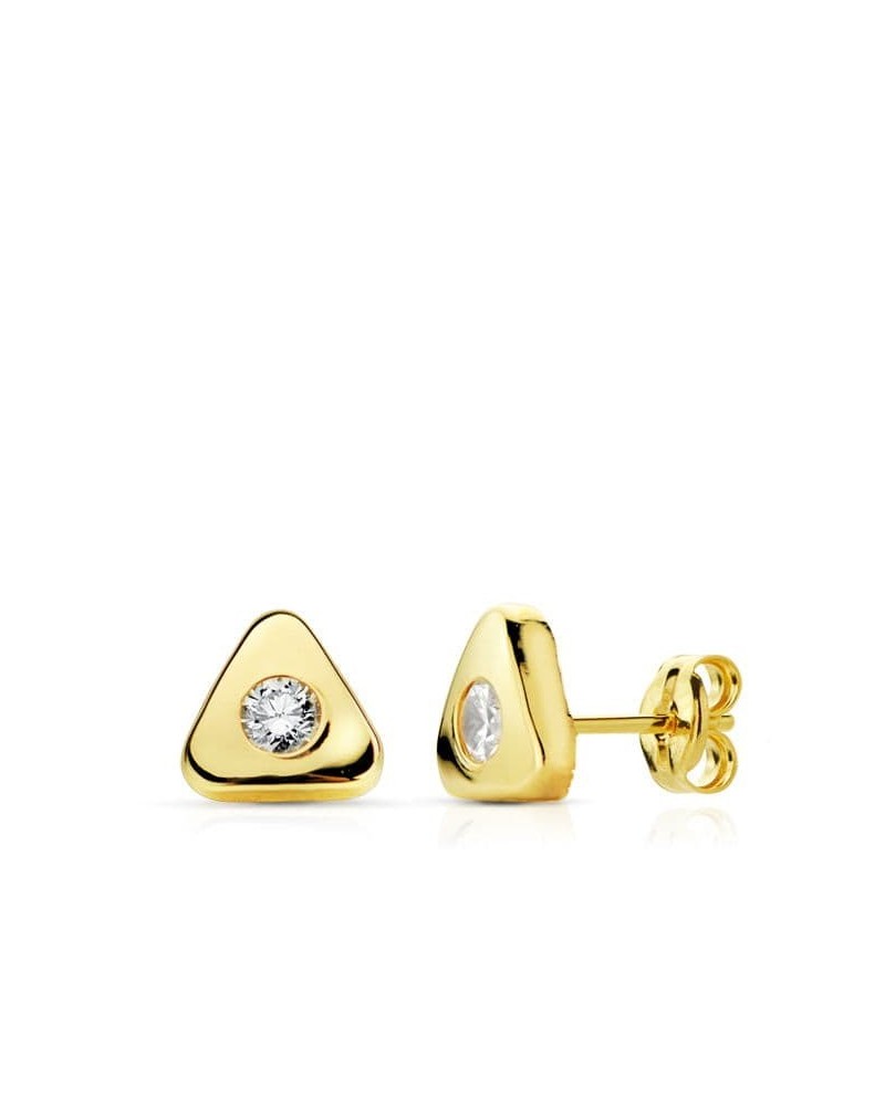 Pendientes de oro amarillo de 18 kilates con diseño triangular moderno y circonita central. Cierre de presión seguro y peso aproximado 0,5 gramos.