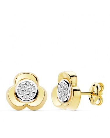 Estos preciosos pendientes infantiles presentan un diseño de trébol en oro bicolor de 18 kilates que combina elegantemente el oro amarillo y blanco. El centro de cada trébol luce una circonita que añade un destello sutil y sofisticado. Su forma redondeada y delicada los convierte en una pieza muy especial para las más pequeñas.