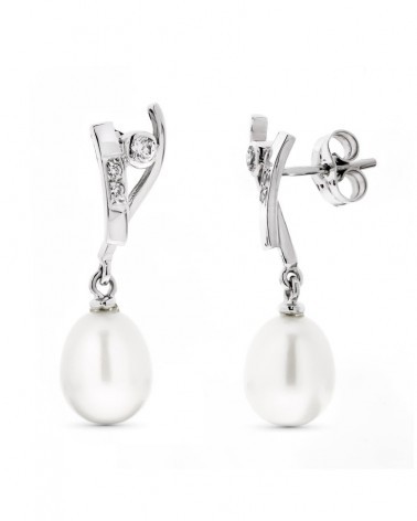 Estos pendientes largos de oro blanco presentan un diseño elegante y sofisticado, perfectos para ocasiones especiales. La parte superior muestra un trabajo geométrico moderno con circonita engastada que aporta luminosidad, mientras que de ella cuelga una hermosa perla natural en forma de pera que añade distinción y feminidad al conjunto.