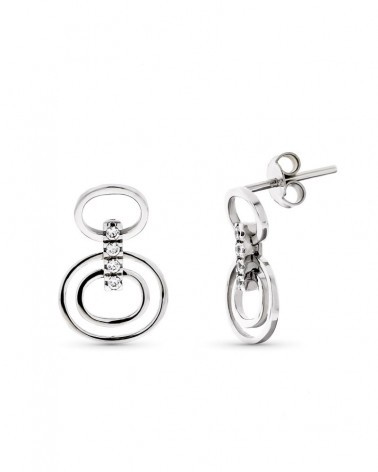 Elegantes pendientes de oro blanco de 18 kilates con diseño de círculos concéntricos unidos por una línea vertical de circonitas. Su acabado pulido y su cierre de presión ofrecen comodidad y seguridad. Peso aproximado 3,1 gramos.