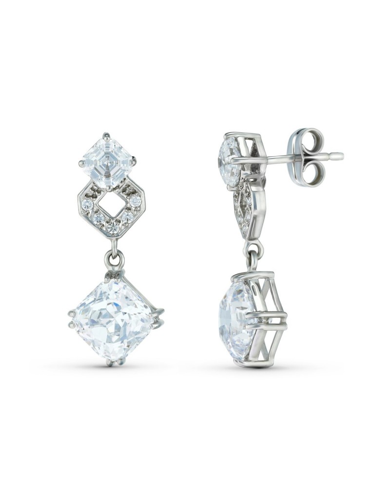 Estos sofisticados pendientes colgantes presentan un diseño contemporáneo de dos cuerpos geométricos que crean un efecto visual muy elegante. El cuerpo superior muestra una forma cuadrada con circonitas que enmarcan un centro calado, mientras que el inferior luce un diamante más grande que aporta luminosidad al conjunto. El oro blanco de 18 quilates realza el brillo cristalino de las circonitas, creando un contraste perfecto.