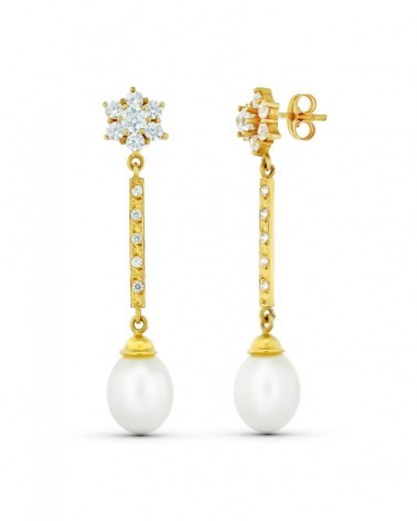 Elegantes pendientes de oro amarillo de 18 quilates con diseño de tres cuerpos: flor de circonitas en la parte superior, barra central engastada con circonitas y perla colgante en la base. Cierre de presión seguro. Peso aproximado 3,6 gramos.