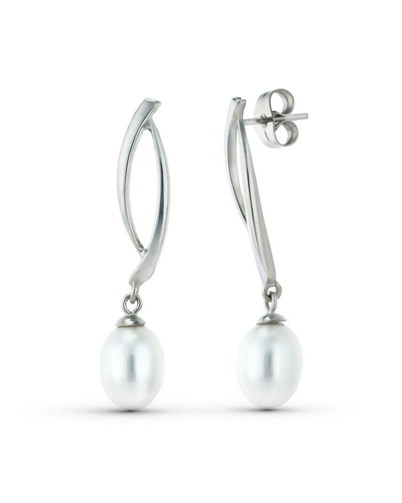 Estos elegantes pendientes presentan un diseño contemporáneo de dos cuerpos en oro blanco de 18 kilates que crea un juego visual sofisticado. La parte superior muestra una forma curvada y estilizada que se extiende desde el lóbulo, mientras que de la parte inferior cuelgan delicadamente unas perlas de brillo nacarado que aportan feminidad y distinción al conjunto.