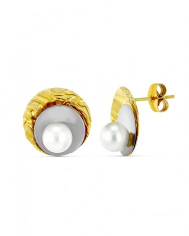 Estos elegantes pendientes redondos presentan un diseño sofisticado que combina la calidez del oro amarillo con la elegancia del oro blanco. La parte superior muestra una textura artesanal en oro amarillo que aporta profundidad y movimiento, mientras que la base en oro blanco pulido crea el marco perfecto para las luminosas perlas cultivadas que protagonizan cada pieza.