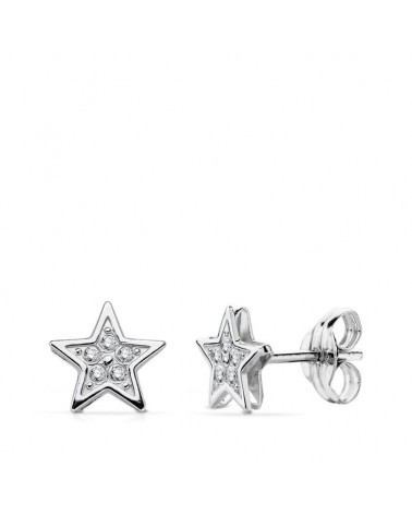 Pendientes estrella en oro blanco de 18 kilates con medidas de 6,5x6,5 mm y cierre de presión, peso aproximado 0,5 gramos. Diseño delicado y luminoso, perfecto para niñas que buscan pendientes cómodos y seguros para el día a día.