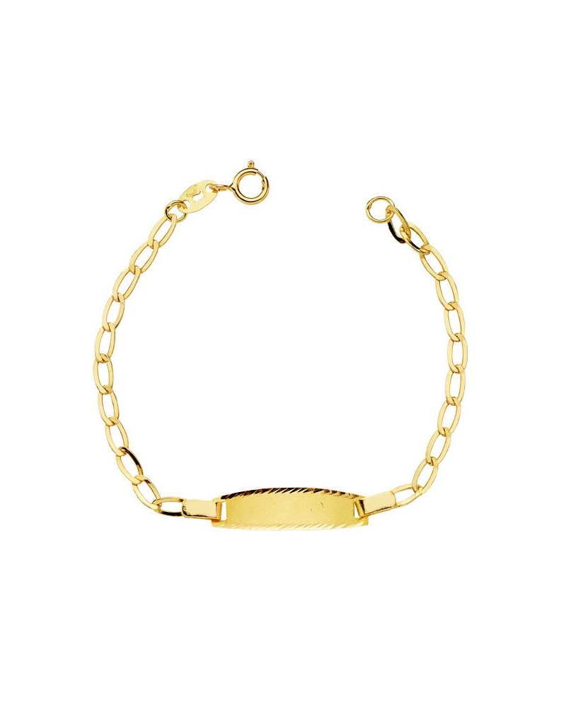 Pulsera para bebé en oro de 18 kilates con un diseño de esclava ideal para grabar el nombre y la fecha de nacimiento.Tiene un largo de 14,5 cm.Incluye una marca de contraste oficial 750 y sello de fabricante. Se entrega con estuche y toda la garantía de la joyería más antigua de España.