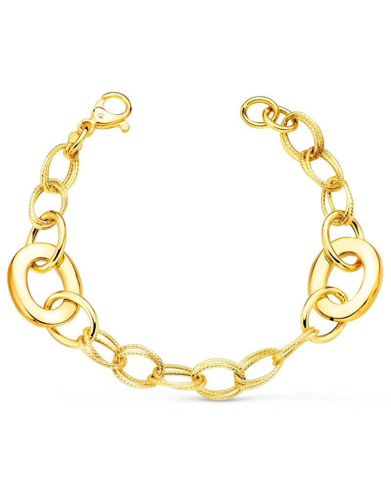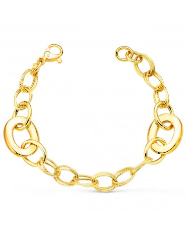 Esta sofisticada pulsera presenta un diseño de eslabones huecos que combina zonas lisas y brillantes con superficies texturizadas, creando un juego visual elegante y contemporáneo. Los eslabones de diferentes tamaños se alternan en una secuencia armoniosa, con algunos elementos que muestran un acabado rayado que contrasta con las superficies pulidas del oro amarillo de 18 quilates.