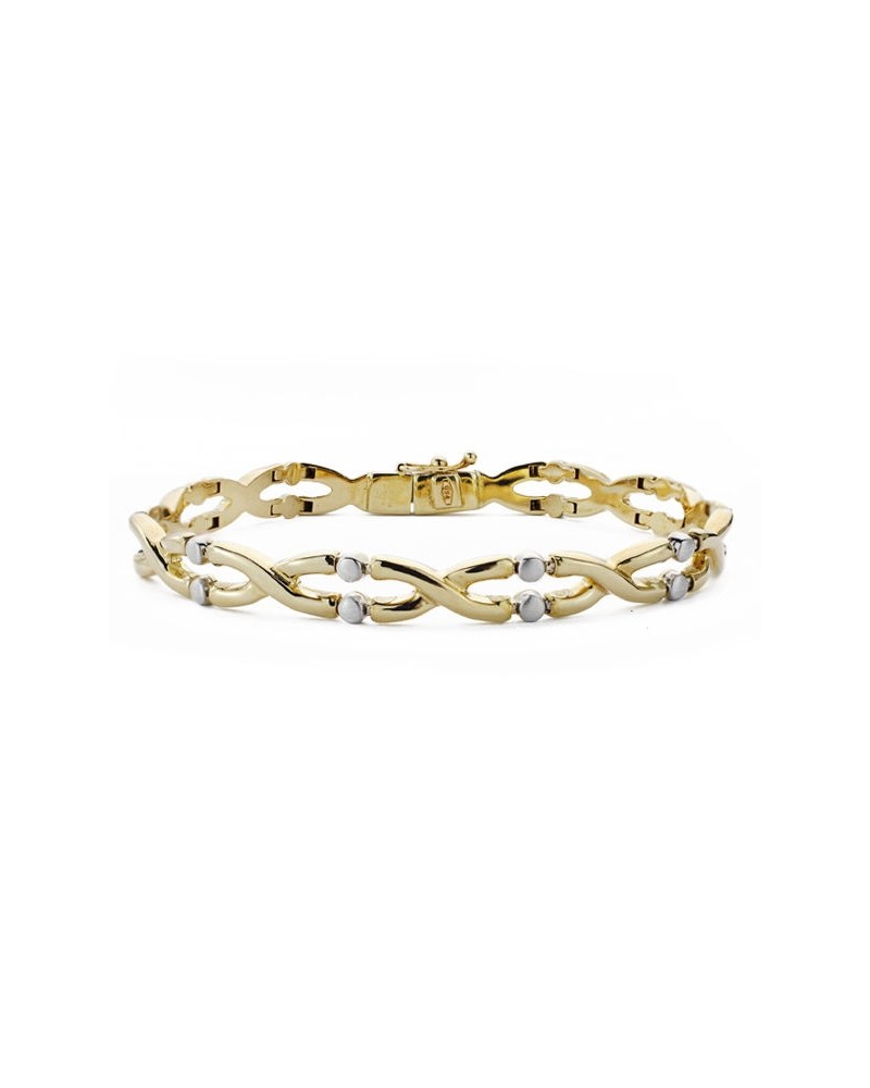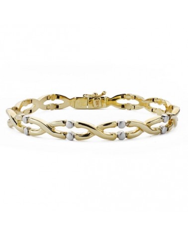 Pulsera de oro blanco y oro amarillo de 18 kilates. Esta pulsera forma parte de la colección de oro de Falomir Joyas. Incluye una marca de contraste oficial 750, sello de fabricante y se entrega con estuche y marca de contraste oficial. Las características de esta pulsera son: Largo: 19 cm, ancho: 7 mm.