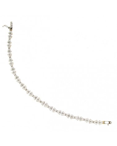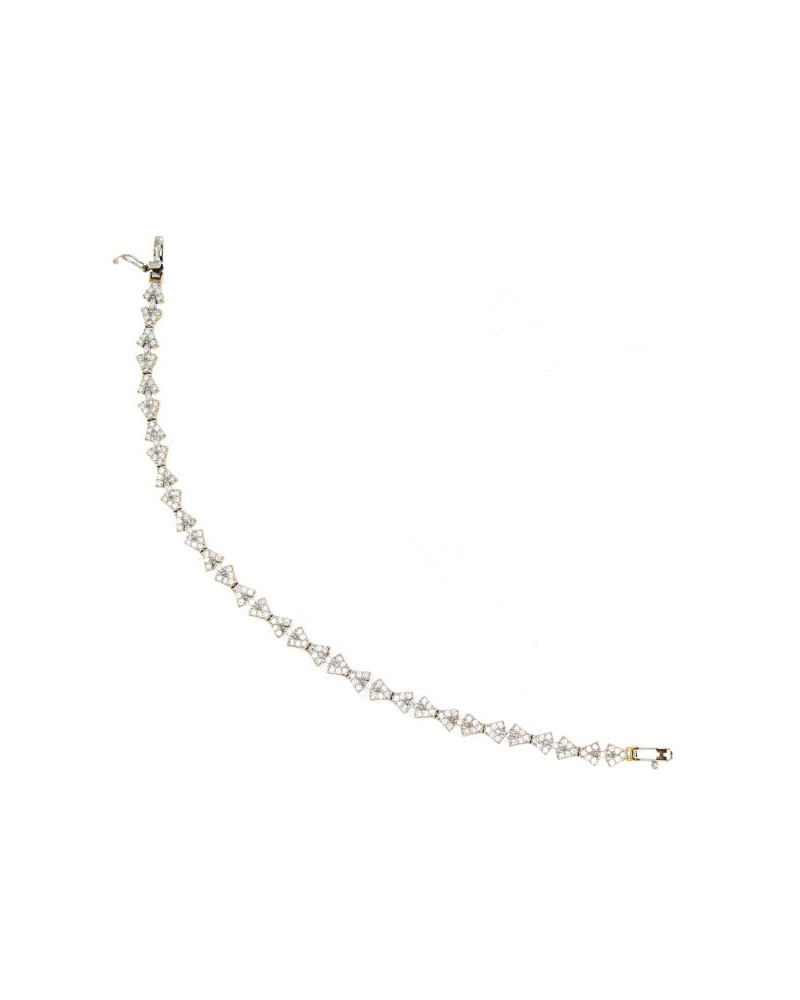 Esta espectacular pulsera de oro bicolor destaca por su diseño geométrico contemporáneo que alterna motivos en oro amarillo y blanco de forma armoniosa. Los elementos calados en oro amarillo contrastan elegantemente con las secciones de oro blanco, creando un efecto visual de gran dinamismo y modernidad.