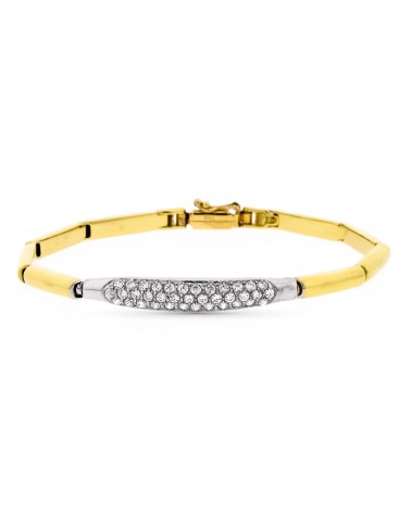 Esta sofisticada pulsera destaca por su elegante diseño bicolor que combina el brillo cálido del oro amarillo con la luminosidad del oro blanco. La pieza presenta una sección central ovalada de oro blanco completamente engastada con circonitas que aportan destellos brillantes, creando un contraste visual muy atractivo con el resto de la pulsera en oro amarillo pulido.