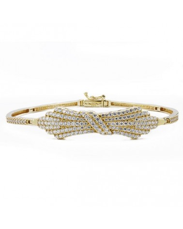 Fabricada en oro amarillo de 18 quilates con circonitas engastadas en técnica pavé, esta pulsera rígida mide 19cm de longitud y tiene un peso aproximado de 10,8 gramos. El cierre de seguridad garantiza un ajuste cómodo y seguro, mientras que el acabado pulido del oro realza el brillo de las circonitas del motivo central.