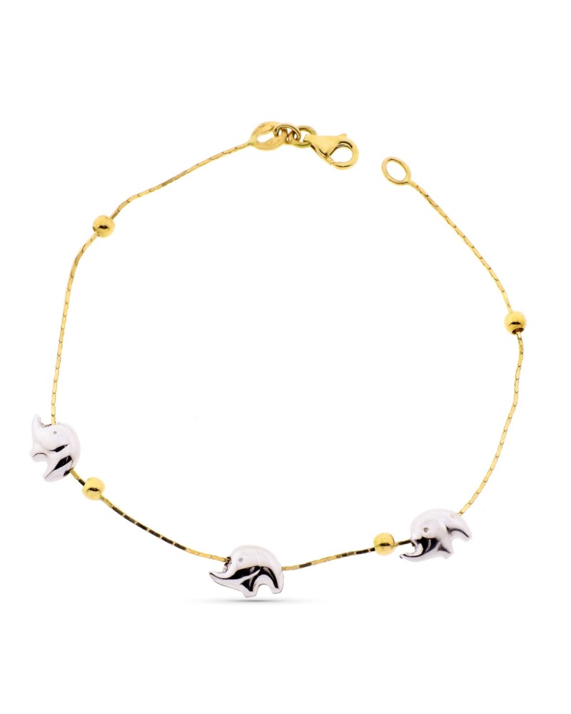 Esta delicada pulsera presenta un diseño encantador que alterna pequeños elefantes realizados en oro blanco con bolas lisas de oro amarillo, creando un contraste visual muy atractivo. Los elefantes, símbolo de buena suerte y sabiduría, están distribuidos armoniosamente a lo largo de una cadena fina que realza la elegancia del conjunto bicolor.