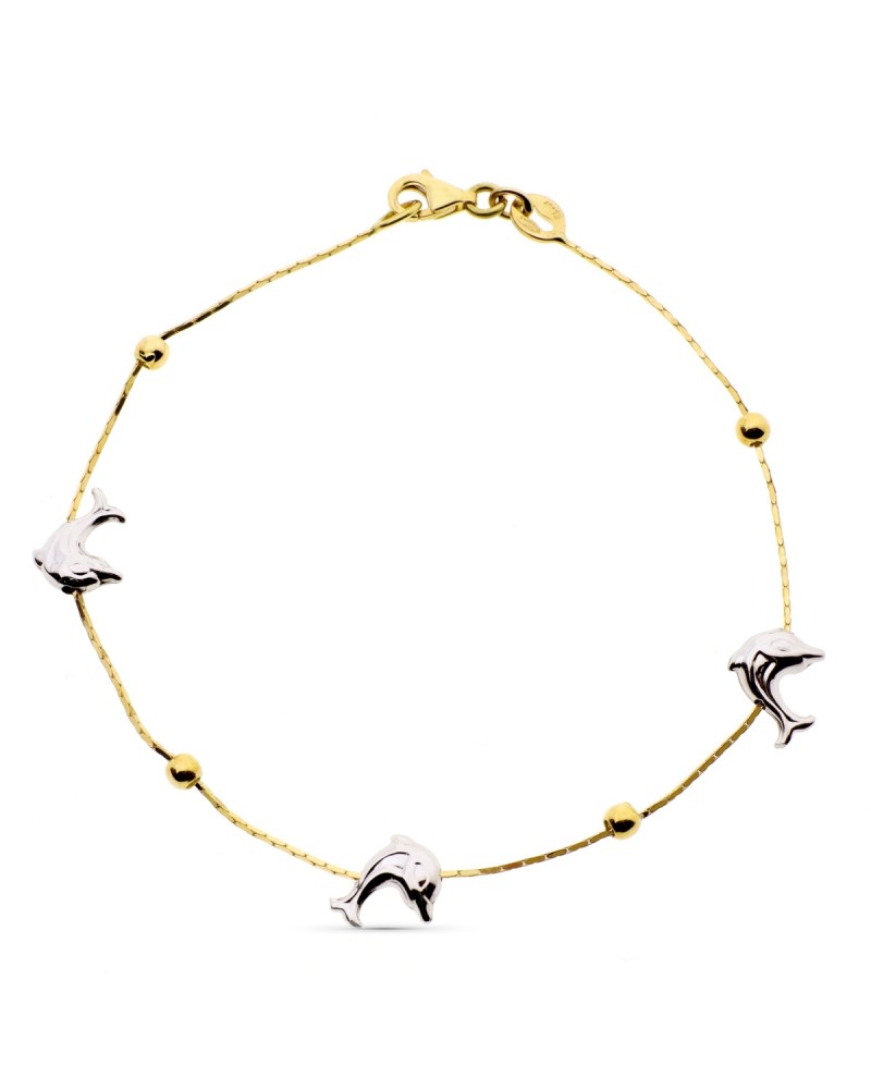 Pulsera oro 18k bicolor delfines y bolas 19cm