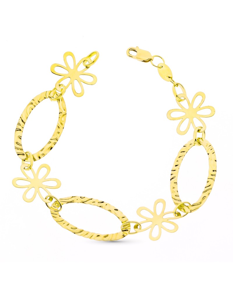 Esta elegante pulsera de oro amarillo destaca por su diseño alternado que combina eslabones ovalados con acabado texturizado tipo diamantado y delicados motivos florales calados. Las flores, con sus pétalos abiertos, aportan un toque femenino y delicado que contrasta armoniosamente con la textura brillante de los eslabones intermedios.