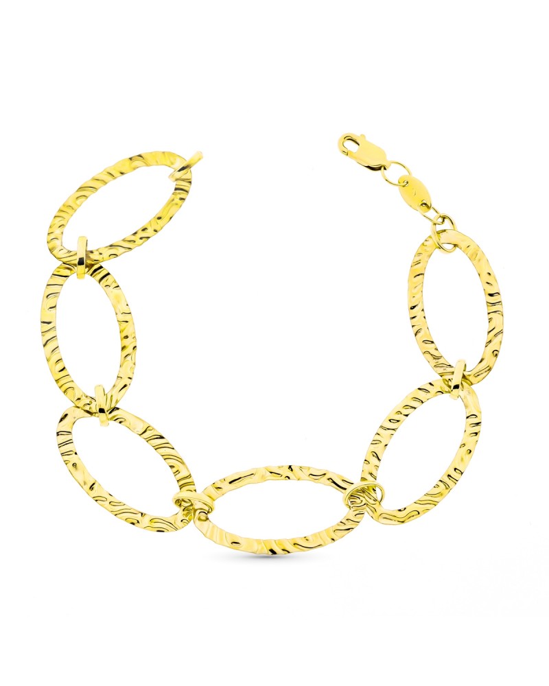 Esta pulsera de oro amarillo presenta un diseño clásico con eslabones ovalados finamente labrados que crean un patrón decorativo elegante. Los eslabones se entrelazan formando una cadena fluida y flexible que refleja la luz de manera sutil, aportando luminosidad y sofisticación a la muñeca.