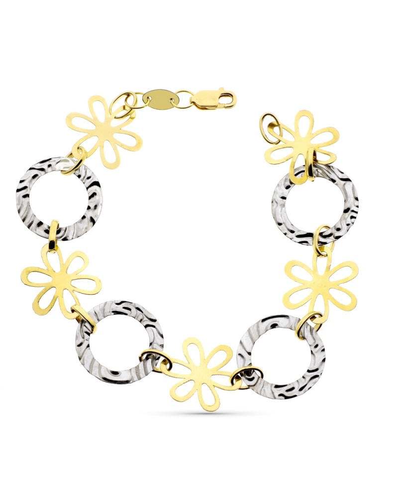 Pulsera oro 18k bicolor flores y círculos ondulados 20cm