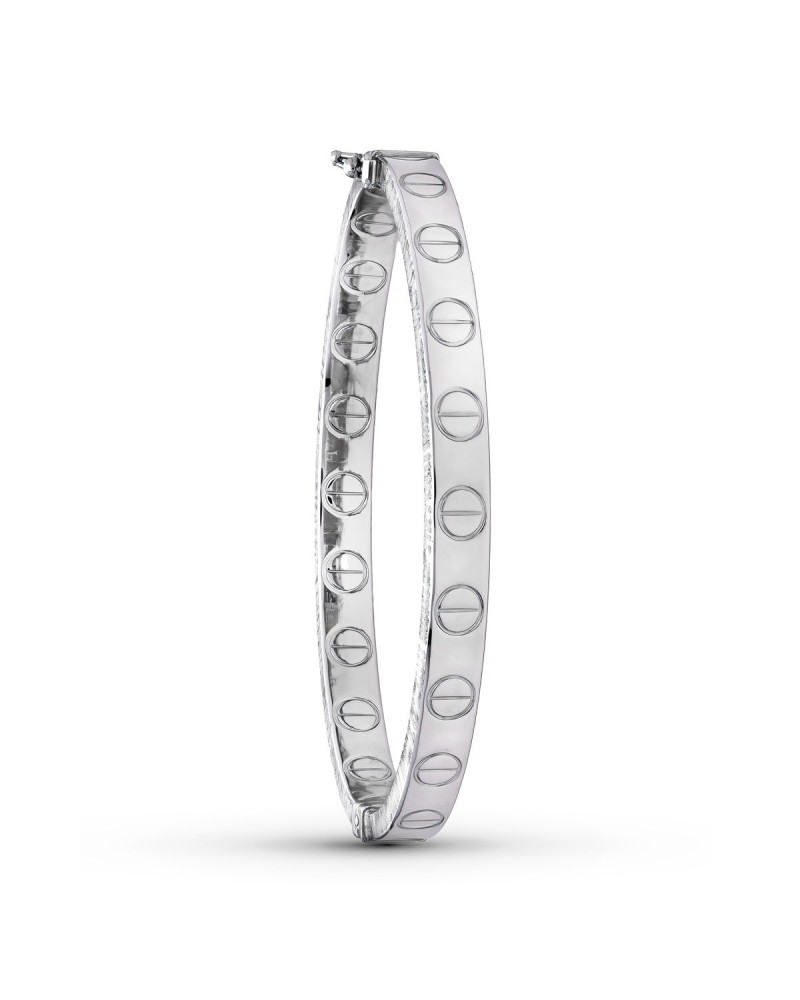 Esta sofisticada pulsera rígida presenta un diseño contemporáneo con motivos circulares que se distribuyen de forma regular por toda su superficie. El oro blanco de 18 kilates le confiere un acabado brillante y elegante, mientras que los círculos con líneas transversales crean un efecto visual moderno y distintivo que capta la luz de manera especial.