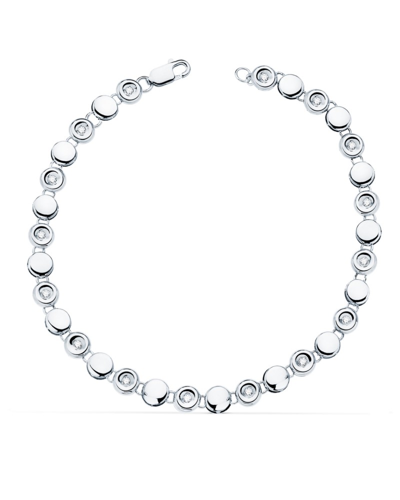 Pulsera de oro blanco de 18 kilates con 16 diamantes talla brillante rodeados por un bisel de oro. Tiene un cierre de mosquetón y diamantes con un kilataje total de 0,240. La pulsera tiene un largo de 18,5 cm.La calidad del diamante es G-VS2. Esta pulsera forma parte de la colección de oro de Falomir Joyas. Incluye una marca de contraste oficial 750, sello de fabricante y se entrega con estuche y marca de contraste oficial. Las características de esta pulsera son: Largo: 18,5 cm.