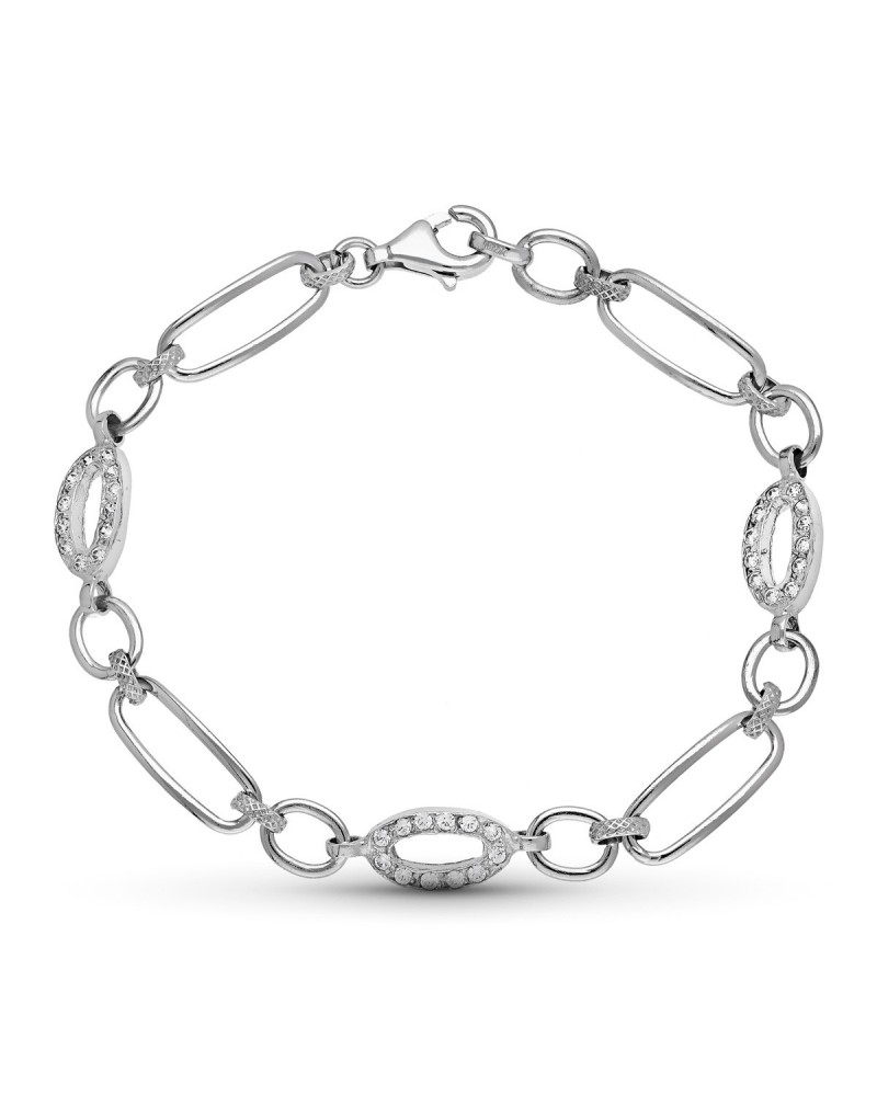 Esta sofisticada pulsera de oro blanco presenta un diseño contemporáneo con eslabones de formas variadas que crean un juego visual muy atractivo. Los eslabones ovalados decorados con circonitas incrustadas se alternan con eslabones rectangulares y circulares lisos, creando un conjunto equilibrado y elegante que refleja la luz de manera sutil.