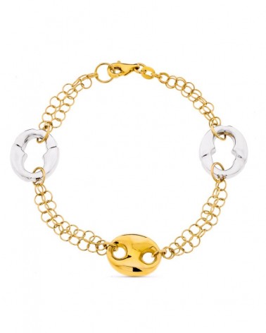 Esta elegante pulsera presenta un diseño sofisticado que combina la calidez del oro amarillo con la elegancia del oro blanco de 18 quilates. Los tres elementos principales son nudos entrelazados: dos en oro blanco con acabado brillante y uno central en oro amarillo, todos conectados por una cadena doble que aporta movimiento y ligereza al conjunto.