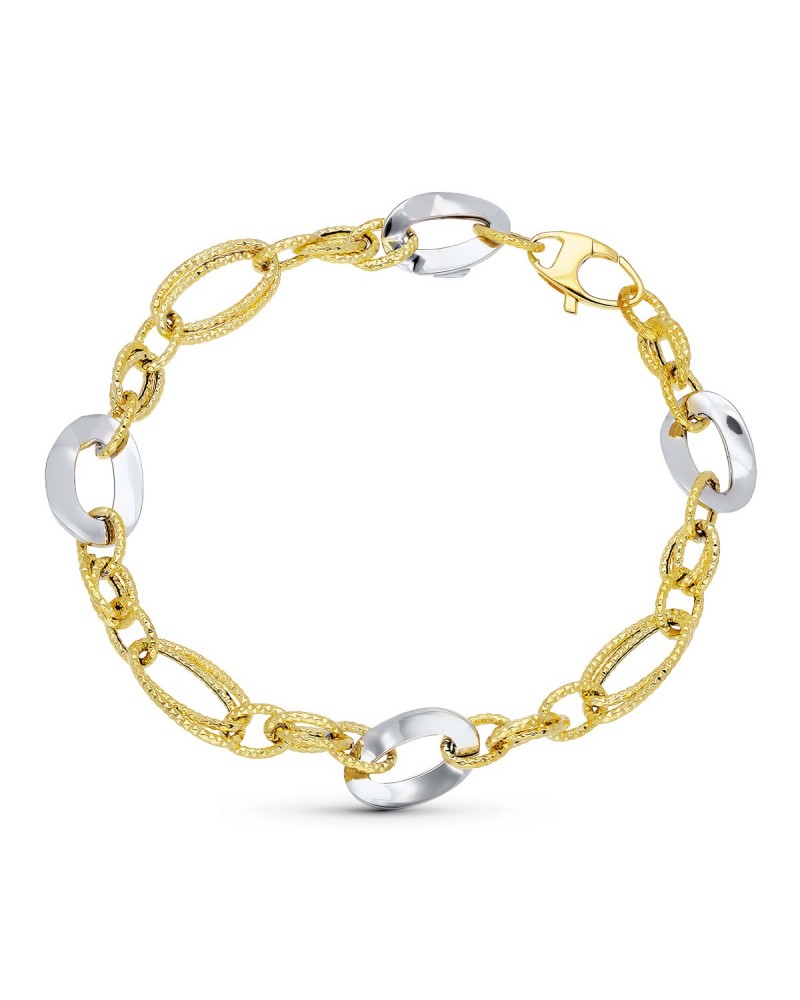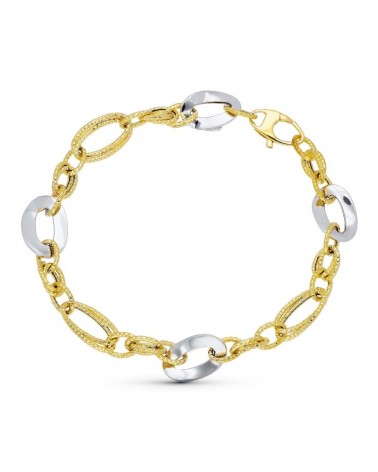 Esta sofisticada pulsera bicolor combina magistralmente oro amarillo y oro blanco de 18 quilates en un diseño de eslabones que destaca por su variedad de formas y texturas. Los eslabones alternan entre formas ovaladas texturizadas en oro amarillo y elementos circulares lisos en oro blanco, creando un contraste visual elegante y moderno que aporta dinamismo a la pieza.