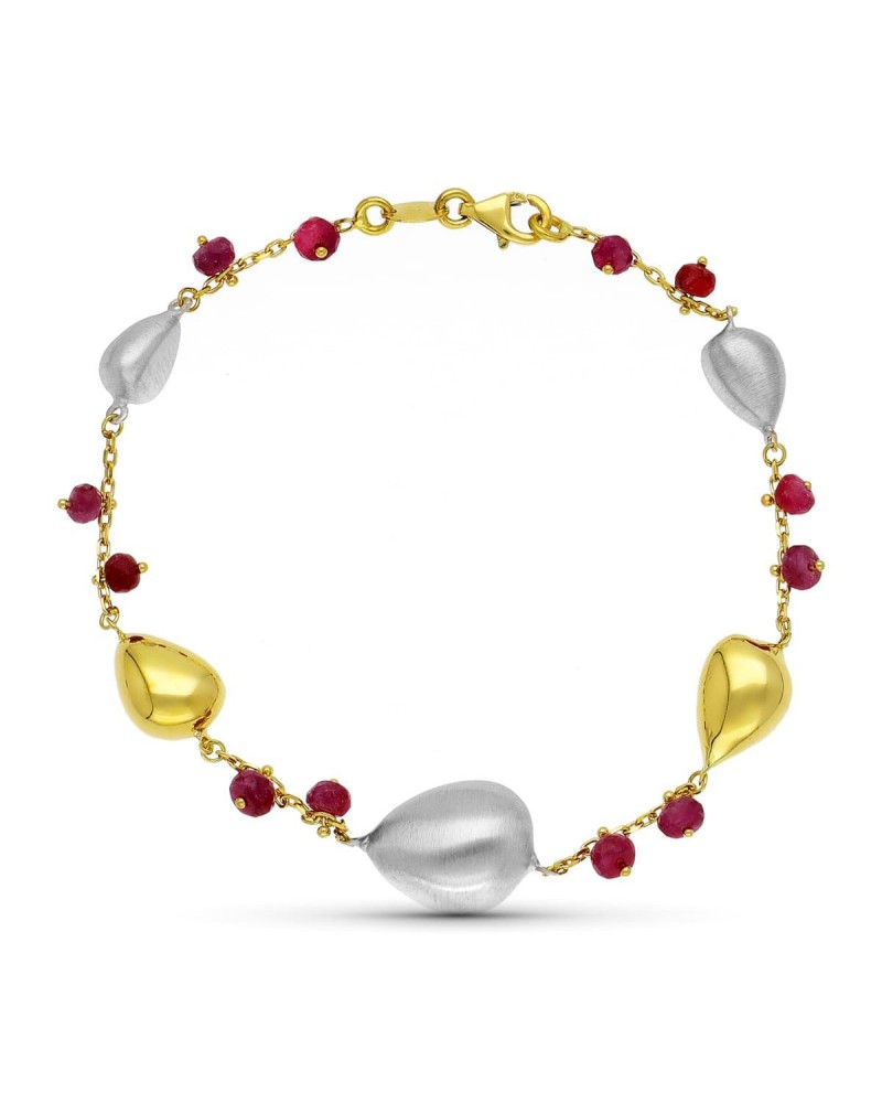 Esta sofisticada pulsera destaca por su diseño bicolor que combina magistralmente oro amarillo de 18 quilates con acabado pulido brillante y oro blanco mate con textura satinada. Los elementos en forma de gota se alternan creando un ritmo visual elegante, mientras que las pequeñas piedras rojas naturales añaden puntos de color que realzan la belleza del conjunto.