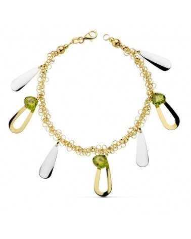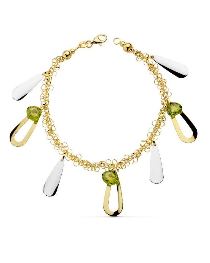Pulsera de oro de 18 quilates bicolor con un elegante diseño de fetiches en oro amarillo y blanco. Presenta formas ovaladas alternadas en ambos tonos de oro, decoradas con piedras de color verde que aportan un toque de color distintivo. Con peso aproximado 10,6 gramos, esta pulsera combina la calidez del oro amarillo con la sofisticación del oro blanco.