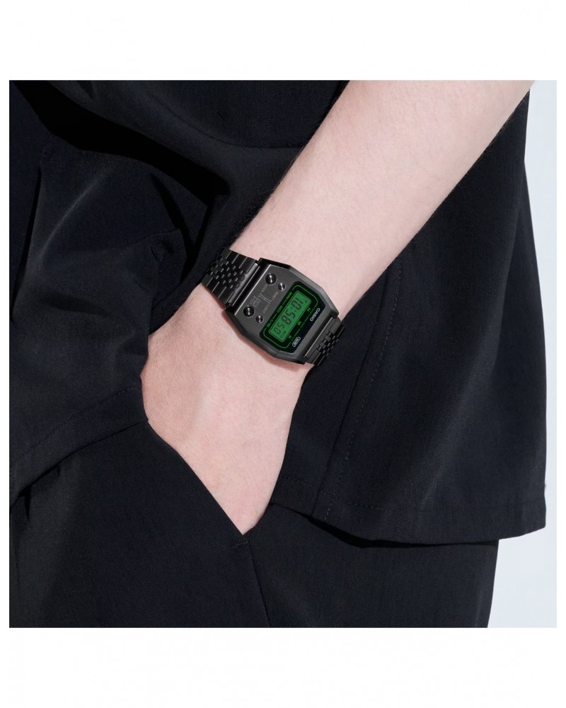 El Casio A1100B-1EF es una pieza que combina el encanto del diseño retro con la durabilidad moderna. Inspirado en los modelos clásicos de Casio, este reloj presenta una caja de acero inoxidable con un acabado minimalista y una pantalla digital de alta legibilidad, ideal para aquellos que buscan un reloj práctico con estilo.