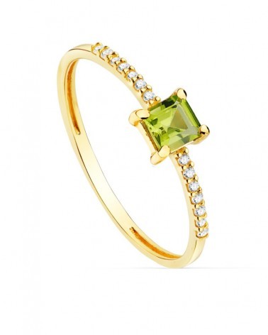 Sortija oro amarillo 14 con con diamantes 0.070 qts. G-vs2. Olivina 4x4 mm cuerpo 1 mm