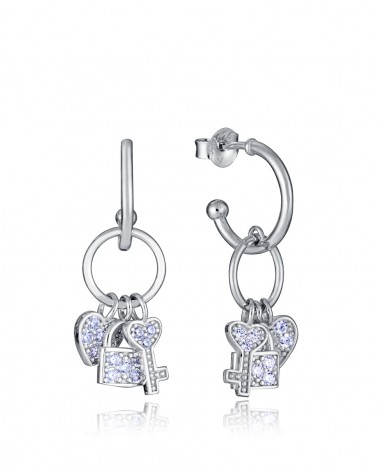 Estos pendientes están formados por un aro con cierre de presión y, un asa donde tenemos colgados: un candado, un corazón y, una llave